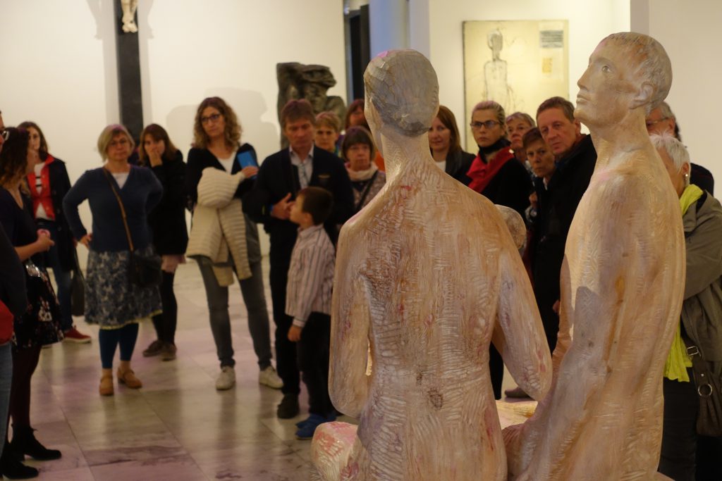 In der Sonderausstellung „Zug um Zug – Was aus Figuren Menschen macht“ im Museum am Dom waren vor allem die Führungen bestens besucht. Hier betrachtet eine Besuchergruppe eine zeitgenössische Skulptur der Heiligen Familie. Foto: Bettina Leuchtenberg, Museumsstadt Trier.